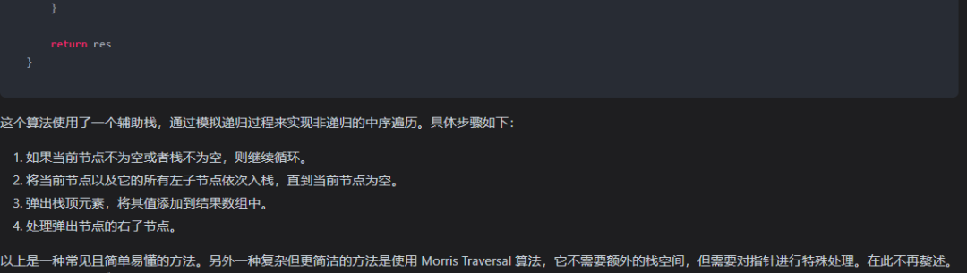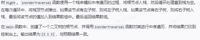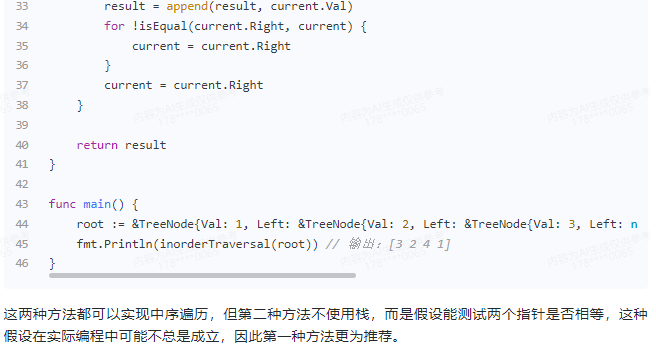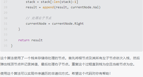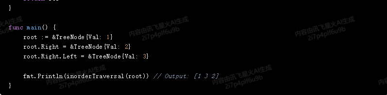 }该代码定义了一个TreeNode结构体,表示二叉树的节点,包含节点的值Val,左子树Left和右子树Right。inorderTraversal函数使用一个栈来模拟中序遍历的过程,将根节点入栈,然后循环处理直到栈为空。在每次循环中,将栈顶节点弹出,如果该节点有左子树,则将左子树入栈,如果该节点有右子树,则将右子树入栈,最后将该节点的值加入到结果数组中。最后返回结果数组。
