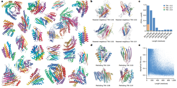 作者团队生成大量蛋白质和蛋白质复合物的无限制样品(100,000个单链蛋白质和20,000个复合物)来表征由Chroma参数化的可能蛋白质的空间,结果表明无条件约束样品和天然蛋白质具有许多相似的特性,如α-螺旋和β-片在连接的褶皱中具有复杂的分层。接着他们对Chroma生成样品和PDB中蛋白质之间结构同源性的定量分析,结果表明该模型产生了自然界未发现的结构,且样品长度越长则与天然蛋白的差距越大。(图2)