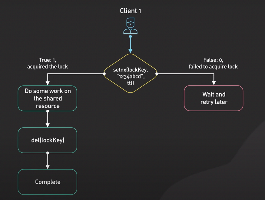 Client 1试图通过使用 SETNX 命令设置具有唯一值和TTL的K来获取锁。如果该K尚未设置,则 SETNX 返回1表示锁已被Client 1获得。Client 1完成其工作。