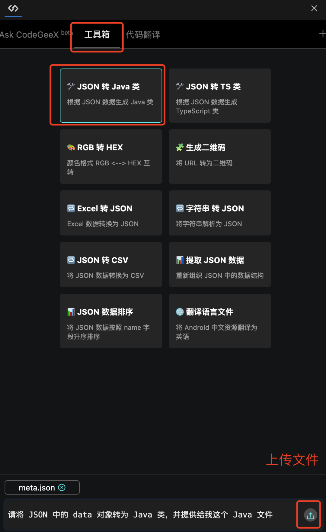 比如 CodeGeeX 新出的工具箱,你可以上传一个 JSON 文件,让 AI 帮你转换为 Java 类代码: