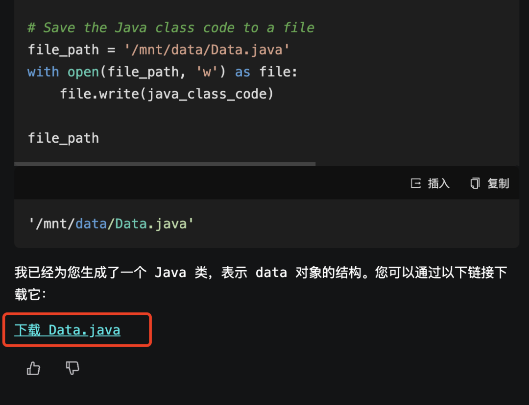 AI 的处理方式很有意思,它接收到这个任务后,自己写了一段 Python 程序来实现文件的读取和代码转换,并最终给我们提供了一个处理好的文件下载地址: