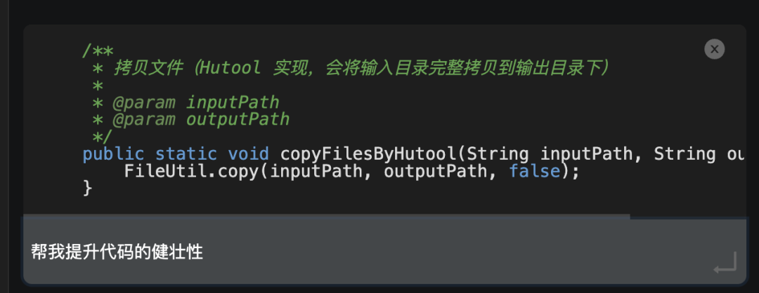 而且咱们还可以利用 AI 来优化代码,比如选中这段代码,让 AI 帮我提升代码的健壮性:
