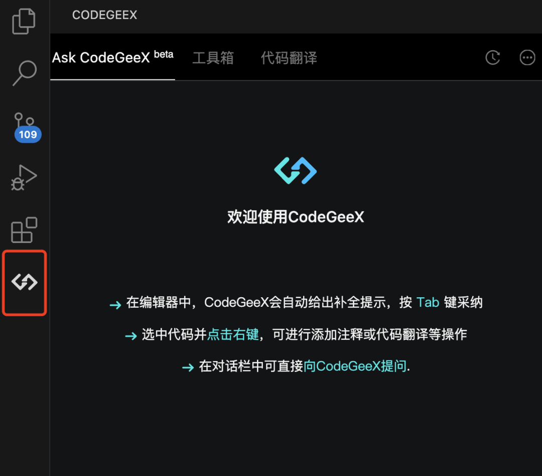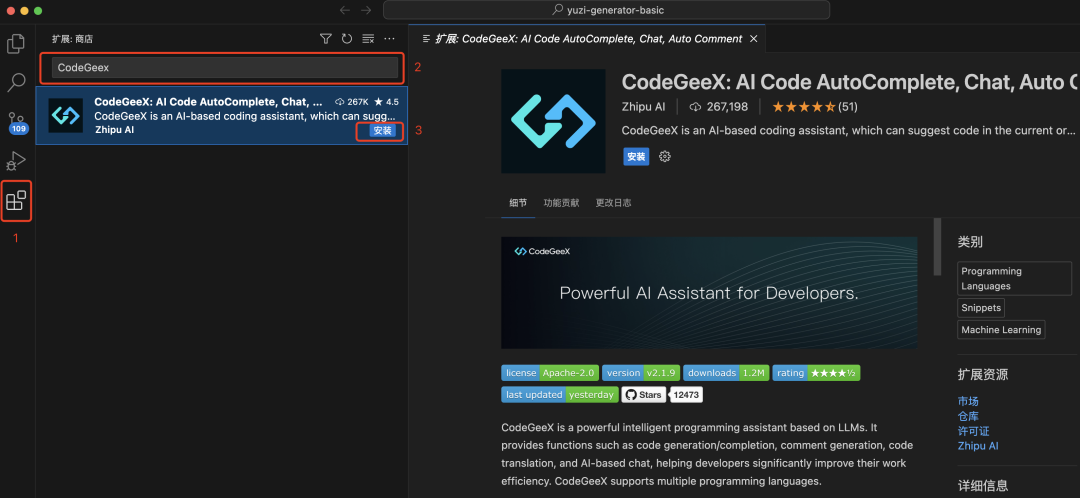 进入 VS Code 的扩展页面,搜索 CodeGeeX 插件,点击安装: