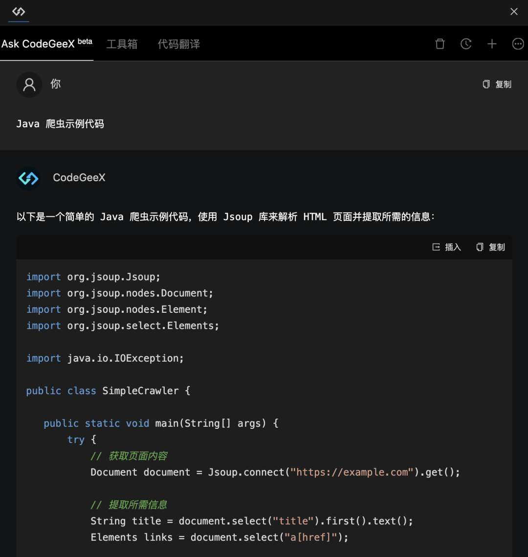 还可以直接向 AI 提问,让它帮你生成完整的代码,比如 “Java 爬虫示例代码”,很快就给出了可以运行的完整代码: