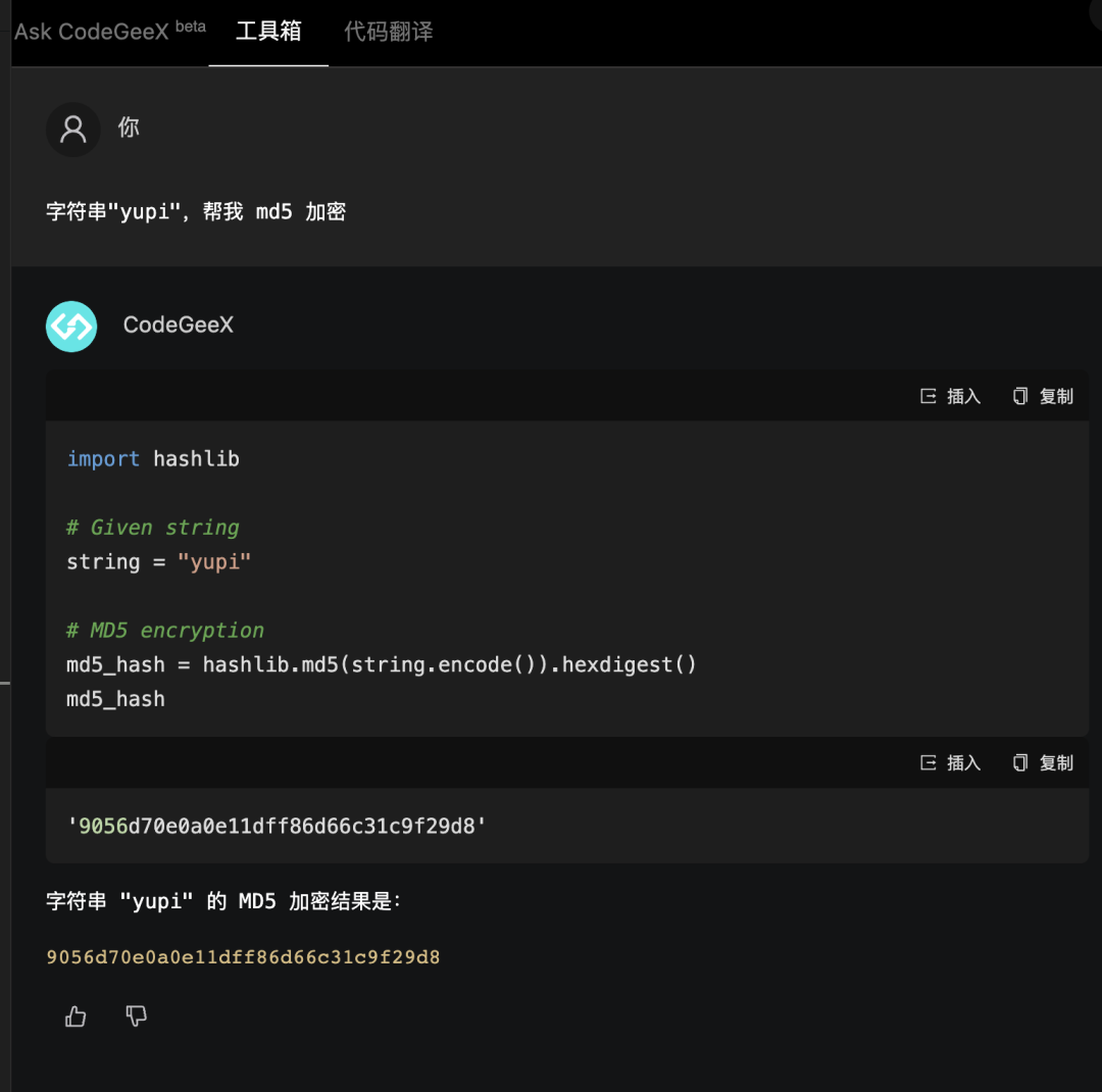 除了使用内置的工具外,你还可以自主向 AI 提问,从而实现更多定制的能力,比如内容加密、数据生成等: