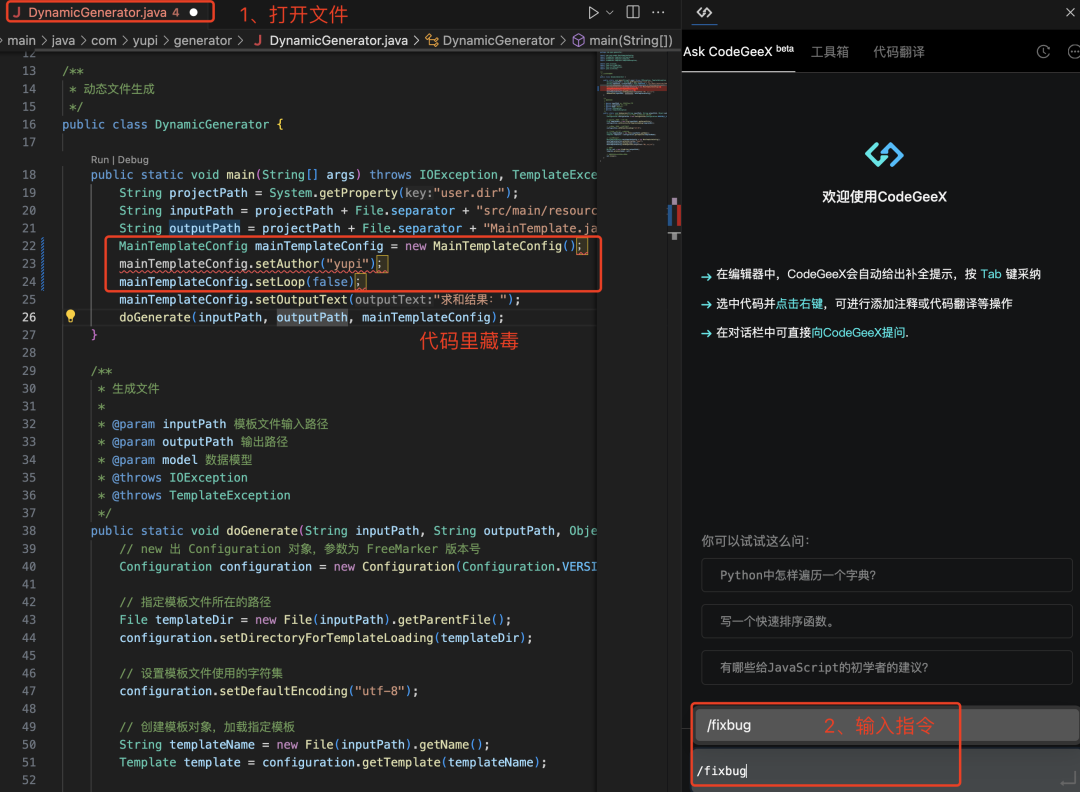 现在有了 AI Bug 修复师,我们只需要打开存在 Bug 的代码文件,然后输入 /fixbug