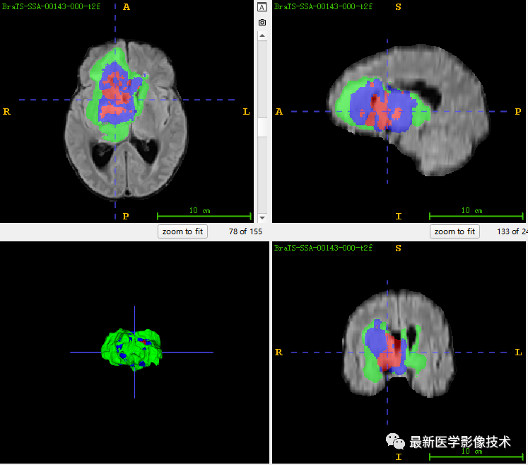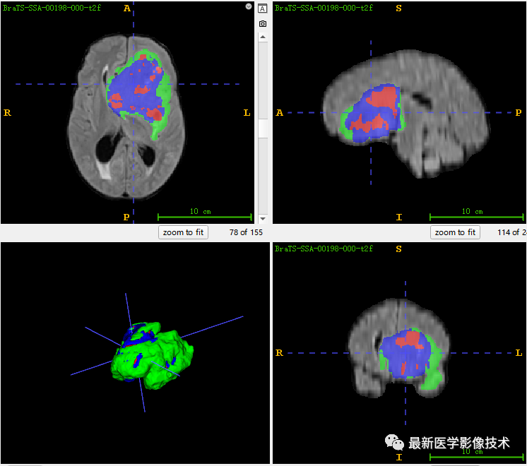 该数据集包括 60 例标注训练样本、15 例未标注验证样本,以及 30 例测试样本。每例提供四种序列 MR 的输入图像(t1w, t1c, t2w, t2f)以及胶质瘤的分割结果,标注内容主要包括非增强肿瘤核心(NC)、水肿(Oedema)和增强型肿瘤(ET):增强肿瘤:包括对比后图像上相对于对比前图像而言 T1 信号显着增加的肿瘤的所有部分。这包括任何离散可见的硬脑膜尾部,但不包括邻近的血管,即使异常增大。内在 T1 高信号也不包含在该标签中。非增强肿瘤核心:包括肿瘤核心的所有不增强的部分(即通常会被外科医生切除的部分)。这包括坏死、囊性变、钙化,甚至延伸至肿瘤的外生性骨质增生。这还包括固有的 T1 高信号,例如瘤内出血和脂肪。周围非增强 FLAIR 高信号:是肿瘤周围 FLAIR 信号异常的整个范围,不属于肿瘤核心的一部分。