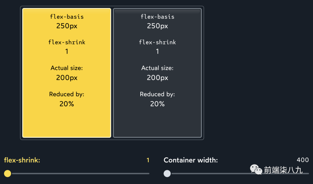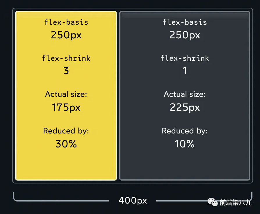 与flex-grow类似,它是一个比例。「默认情况下,两个子元素的flex-shrink都是 1,因此每个子元素消化亏空的一半」。它们各自放弃 50px,它们的实际大小从 250px 缩小到 200px。