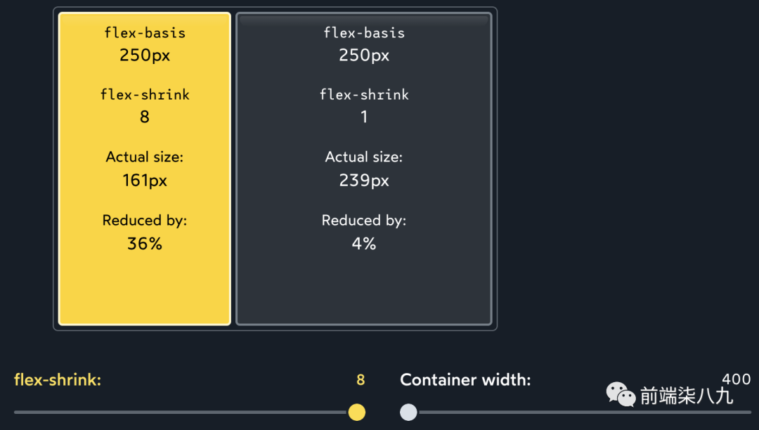 两个项目都会收缩,但它们会「按比例收缩」。第一个子元素始终是第二个子元素宽度的 2 倍。