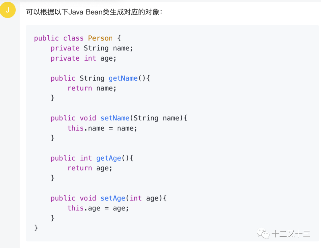 我们可以给大模型,输入一段 Json 数据,让它根据 Json 数据生成相应的 Java Bean 对象。