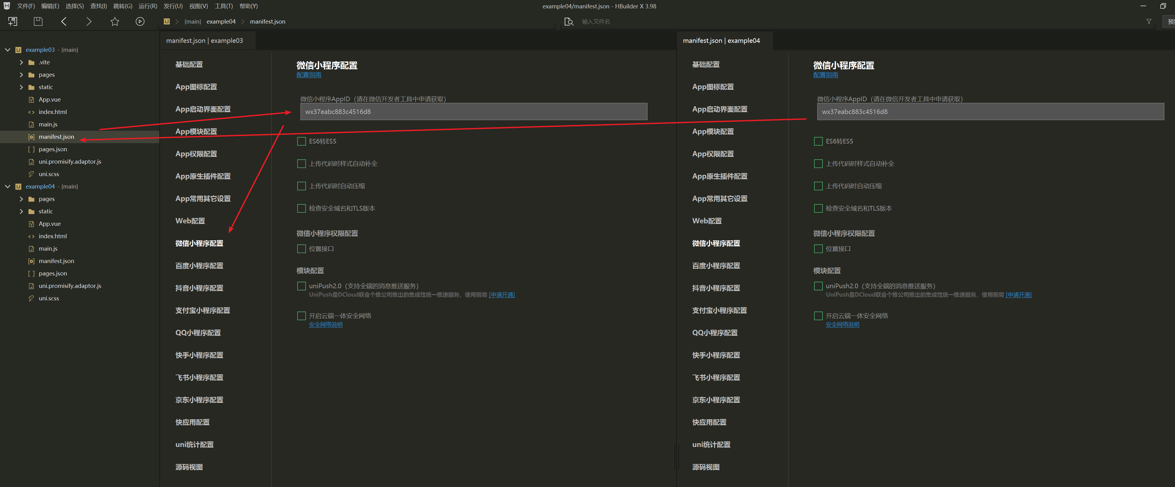 然后在配置一下,微信小程序的 AppId,直接去之前的项目中拷贝一下即可,找到之前项目的 manifest.json 文件,然后选择微信小程序配置,复制一下即可: