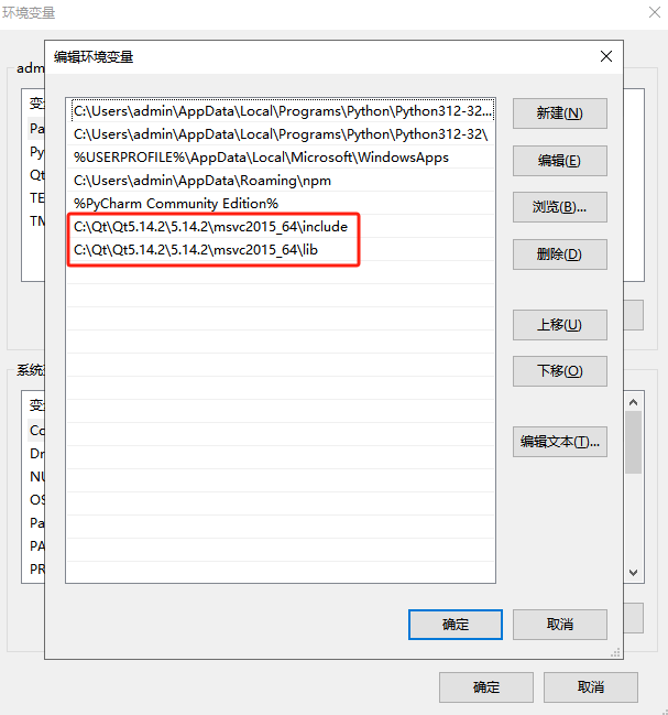 此处的头文件和库目录就是需要配置的环境变量,打开环境变量,并依次配置如下两个头文件到系统中;