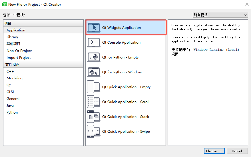 Qt程序的创建非常简单,只需要打开Qt Creator主页面,选中文件并新建,在弹出的选择菜单中Qt Widgets Application用于新建窗体应用程序,而Qt Console Application则用于新建命令行程序,我们以窗体程序为例,直接点击Choose按钮创建新程序,如下图;