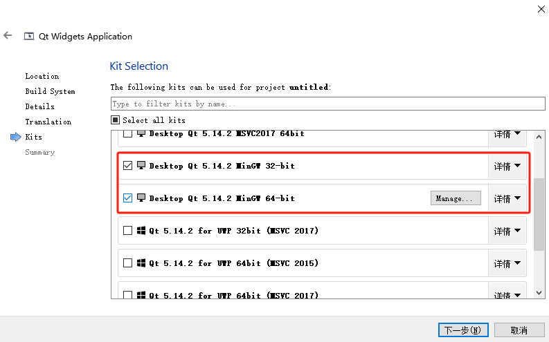 读者只需要根据提示信息选择对应的创建位置其他参数保持默认即可,需要注意在Kit选项卡中,读者最好选择MinGW编译器以方便课程的跟进,如下图所示;