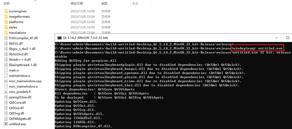 2.执行windeployqt untitled.exe命令进行自动打包。如果是自动打包我们可以进入Qt提供的命令行页面,跳转到需要打包程序的目录下,执行命令即可打包出所有的依赖文件,如下图;