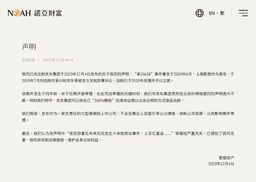 2023年11月24日,诺亚财富旗下上海歌斐资产管理有限公司和上海自言汽车租赁服务有限公司,对“承兴系”公司和京东的诉讼,在上海金融法院开庭审理,寻求向京东索要35亿元巨额赔偿。