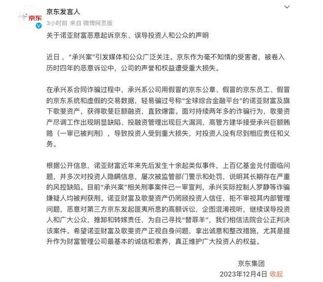 12月4日,京东方面通过官方微博发表声明,在“承兴案”中,公司作为毫不知情的受害者,遭受了历时四年的恶意诉讼,导致公司声誉和权益受到重大损失。