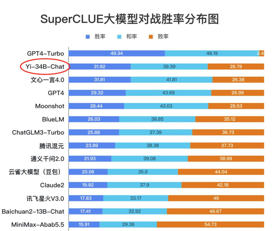 中文能力方面,Yi-34B-Chat 微调模型的表现也较为令人意外。根据11月底发布的《SuperCLUE中文大模型基准评测报告 2023》,11月下旬首度发布的 Yi-34B Chat在多项基准评测中的 “SuperCLUE 大模型对战胜率” 这项关键指标上,Yi-34B-Chat 取得31.82%的胜率,仅次于GPT4-Turbo。