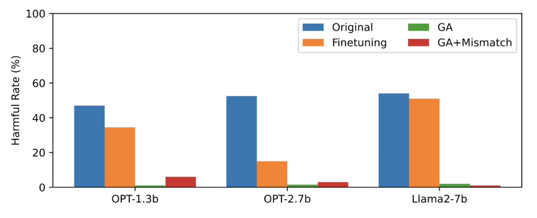 文中使用的方法为 GA(梯度上升和 GA+Mismatch:梯度上升 + 随机误配)。遗忘学习后的有害率接近于零。