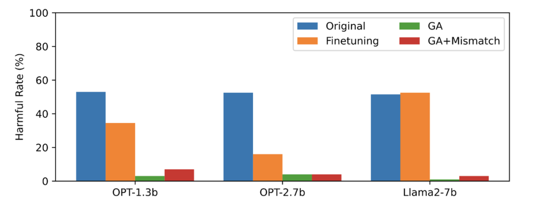 本文用 PKU-SafeRLHF 数据作为遗忘数据,TruthfulQA 作为正常数据,下图显示了遗忘学习后 LLM 在忘却的有害提示上输出的有害率。