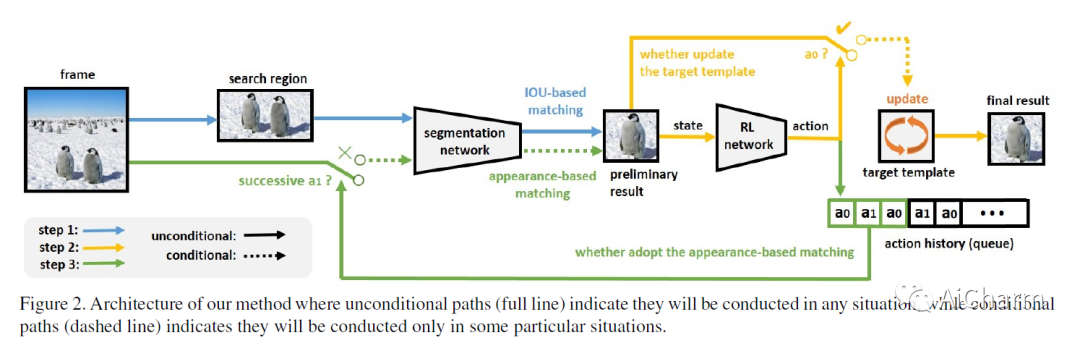 针对步骤 2,基于外观的匹配方法(siamese)准确但非常耗时,而直接利用候选框与前一帧预测框的 IOU 进行快速匹配只适用于目标缓慢移动或变化。针对步骤 3,现有方法简单地直接用当前结果替换模板,不考虑结果的正确性,会导致误差逐渐累积。因此需要利用强化学习智能切换。