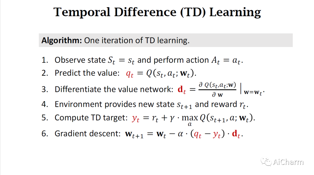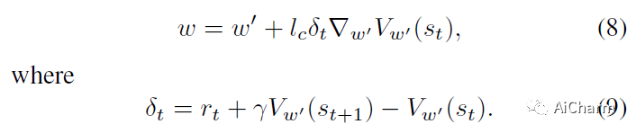 \delta_t 表示 TD error,公式 8 中梯度下降用加号是因为公式 9 减法顺序和常规的是反过来的。