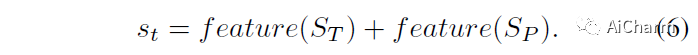 输入 agent 的状态s_t包括两部分,如下式。第一部分S_T是模板图像,其中边框T’_{box}之内的内容保持不变,之外的内容填充黑色;第二部分S_P是搜索图像,同样将 mask 之内的内容保持不变,之外的内容填充黑色。提取这两种图像的特征并相加得到输入状态。