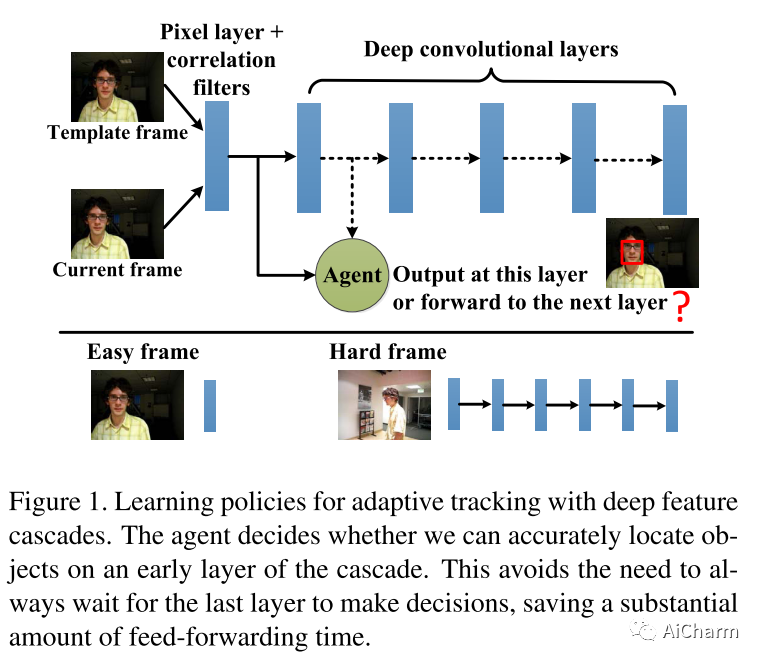 第一篇来自 ICCV2017,出发点是不同复杂程度的跟踪场景对特征的需求是不同的,对于简单场景使用浅层特征(甚至像素特征)就能处理,而对于一些复杂场景才需要具有更强语义信息的深度特征。这个自适应决策的问题可以通过基于 Q-learning 的强化学习完成,如图 1 所示,学习一个 agent 来判断当前特征是否已经可以以较高的置信度定位目标,还是需要继续计算更深层的特征来寻找目标。