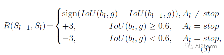 Rewards: 奖励函数R(S_{l-1},S_l)反应了采取动作A_l后,从状态S_{l-1}到状态S_l的定位精度提升(或下降),精度采用 IOU 衡量,奖励函数计算如下: