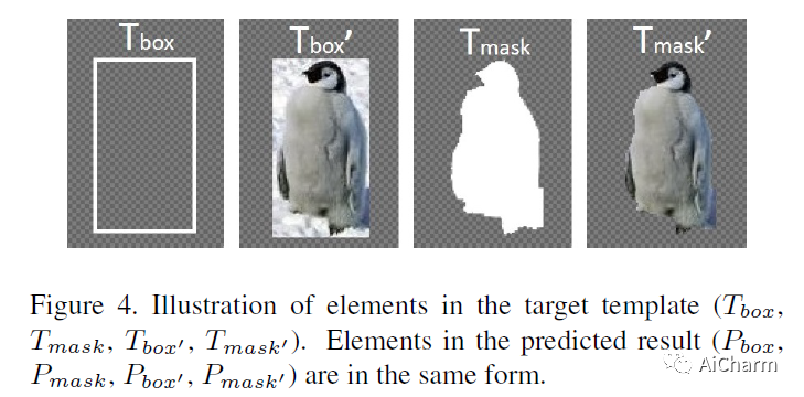 首先定义相关的符号,如图 4 所示,目标模板包括边界框 T_{box},mask T_{mask},T_{box}中的图像内容T’_{box},T_{mask}中的图像内容T’_{mask}。而预测结果则是类似的P_{box}, P_{mask}, P’_{box}, P’_{mask}。