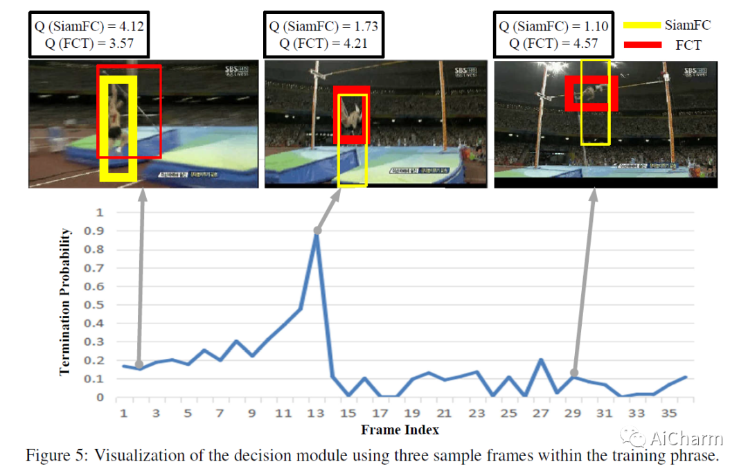 图 5 是一个可视化结果,其中终止概率 1 表示终止,0 表示保持不变。可以看到初始是 SiamFC(黄框)表现较好;当发生形变后,FCT 的价值函数更大,终止概率趋近 1,跟踪器切换;之后一直都是 FCT 表现更好,因此终止概率始终在 0 附近。