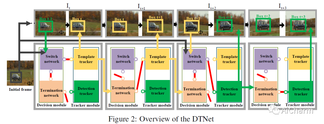 整体框架如图 2 所示,包括决策模块和跟踪模块。决策模块是一个 Actor-Critic(or Option-Critic?)结构,包括 switch network 和 termination network。首先将初始帧模板和上一帧跟踪结果送入 switch network,输出一个二元信号选择跟踪器。跟踪器结果送入 termination network,输出终止当前跟踪器的概率。注意这里终止之后并不一定切换到另一个跟踪器,因为并不能保证另一个就更好,而是要经过 switch network 重新选择。