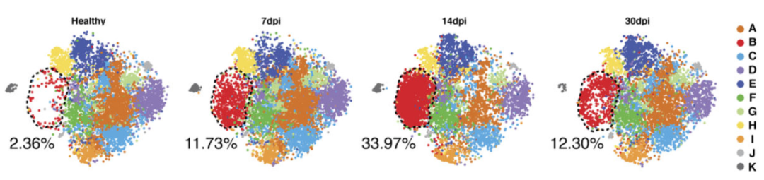 为了探索不同簇在心肌梗死期间的潜在作用,分析了每个簇中细胞百分比的变化。发现簇F和H-K在不同的时间点保持不变,而簇B在MI后表现出显著的变化。