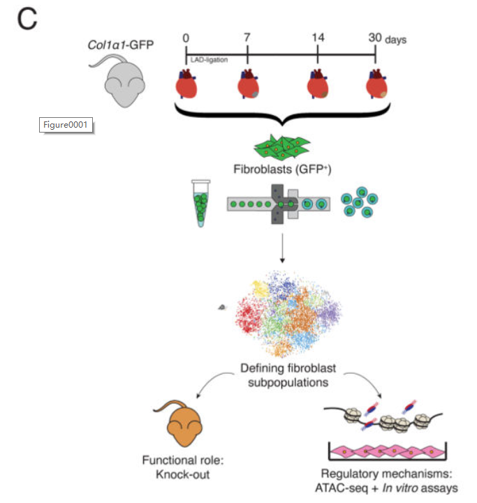 心肌梗死(MI)后,用单细胞和bulk RNA-seq、ATAc-seq和功能测定对胶原-1GFP+CF进行鉴定。