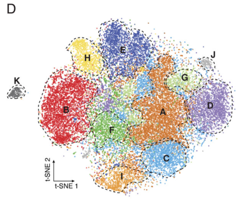 对全局数据集的无监督聚类显示了11个GFP+细胞簇。其中10个簇(a - j)代表不同的成纤维细胞亚群,以高水平的成纤维细胞相关分子为特征,而簇K包含经典周细胞标志物高表达的群体。