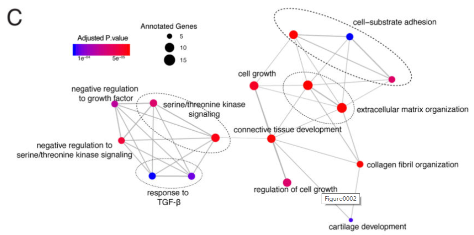 通过GO富集分析发现,与其他集群相比,B集群的转录特征在与细胞外基质组织、细胞增殖和细胞-底物黏附相关的途径上显著丰富。