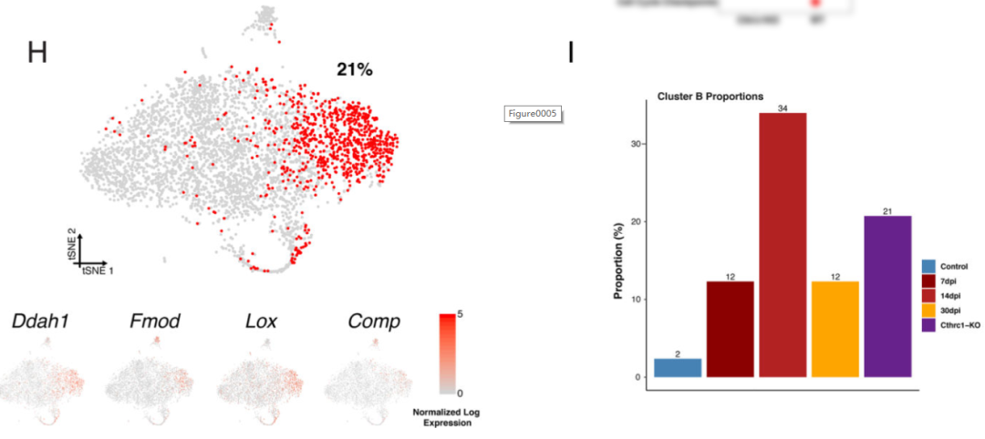 进一步探究发现,B簇代表梗死心肌中活化的Periostin+成纤维细胞亚群,在修复性心脏纤维化过程中发挥主要作用。因此,将这些细胞命名为修复性心脏成纤维细胞(RCF)。