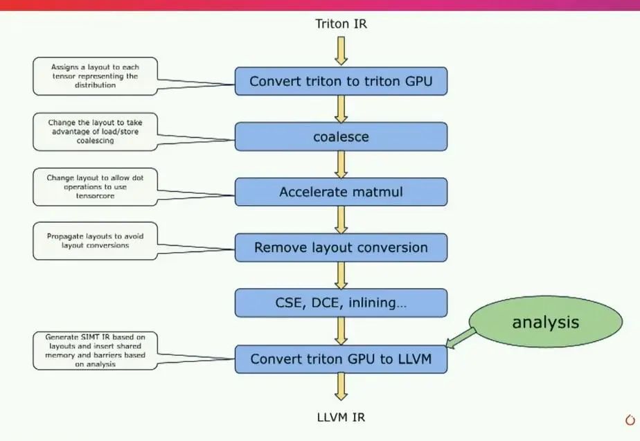 如果机器有tensorcore,我们会尝试使用非常适合tensorcore的布局。然后,我们会尝试避免任何布局转换,应用一系列典型的编译器传递,然后在此基础上进行转换,基于分析转到llvm ir。