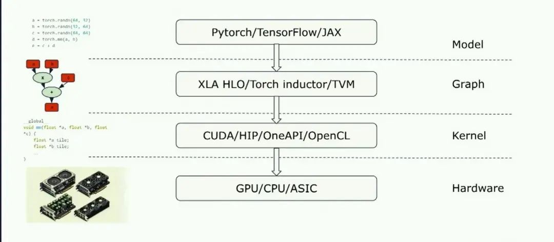 之后我将讨论,如何在典型的设备上使用triton,除了内核他还可以集成到完整的graph编译器堆栈中: