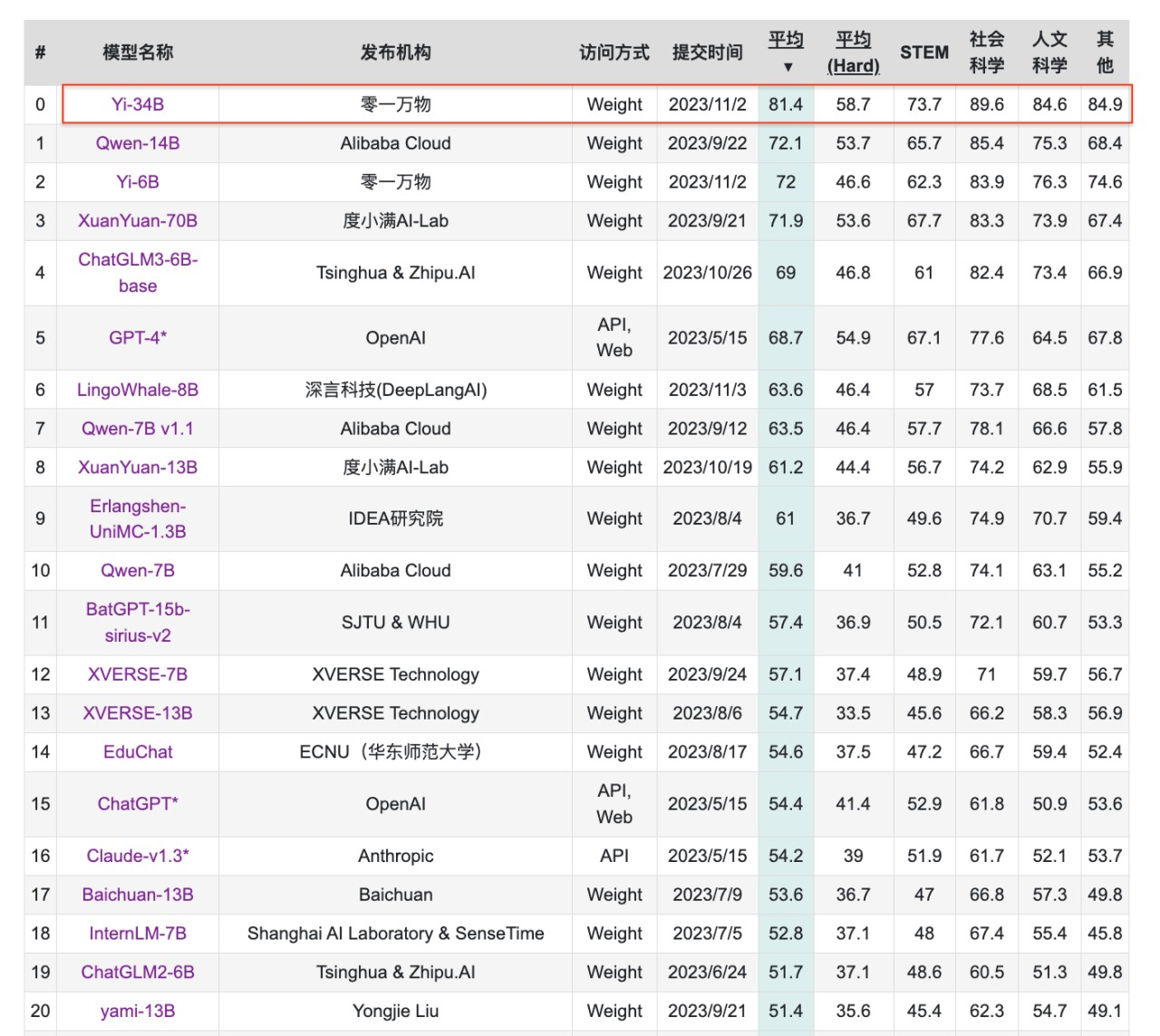 根据Hugging Face英文开源社区平台和C-Eval中文评测所提供的最新榜单,Yi-34B分别在预训练大语言模型和中文大模型榜单C-Eval排行榜爬升到第1位。这也是迄今为止唯一成功登顶 Hugging Face全球开源模型排行榜的国产模型。