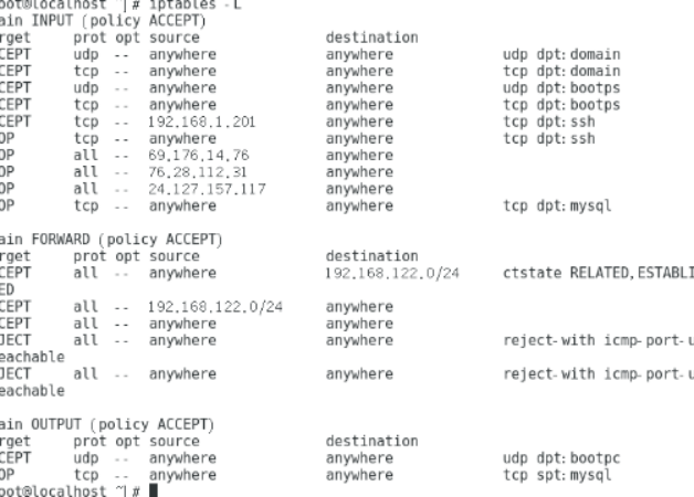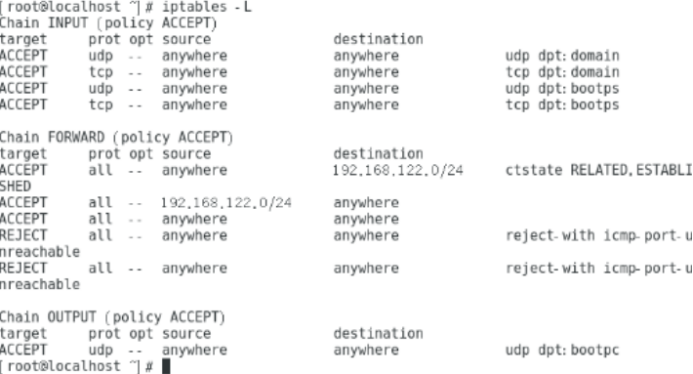 在服务端命令行中输入如以上命令,执行完以上命令后输入iptables -L查看配置结果,如下下图所示: