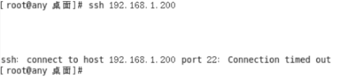 9、打开客户端B的终端,输入ssh 192.168.1.200(服务端IP)连接到服务器,提示网络错误,连接超时。如下图所示:
