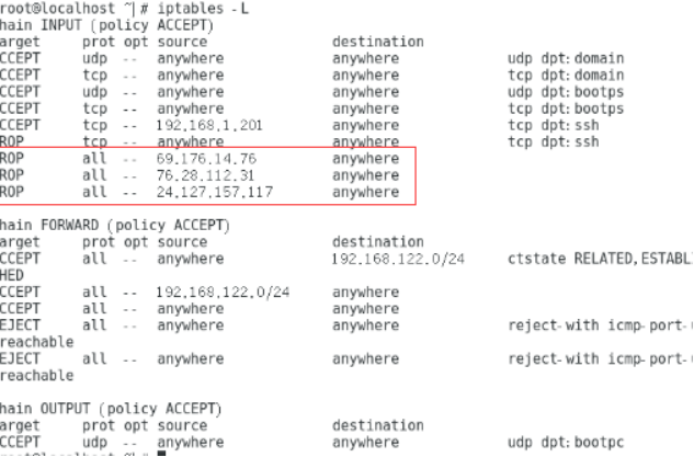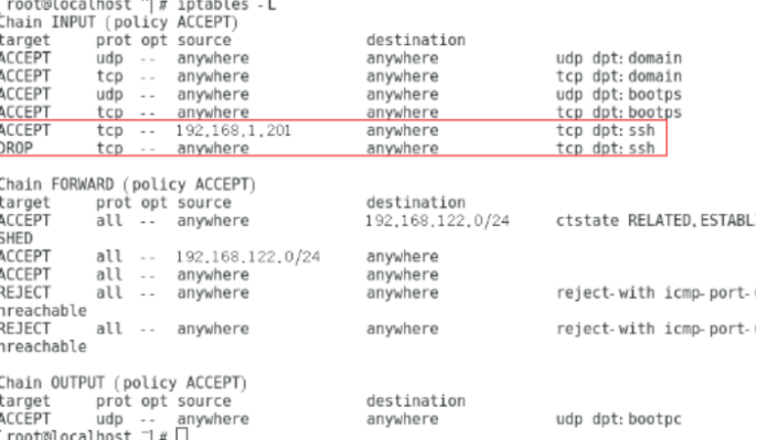 5、配置完成后,在命令行中执行iptables -L查看刚才配置的策略,如下图所示:
