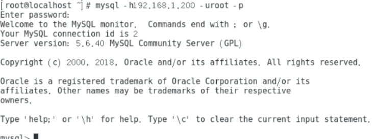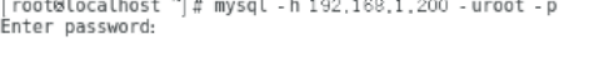 13、打开客户端A,在终端中输入命令:mysql –h 192.168.1.200 –uroot –p(IP地址为服务端IP,密码为123456),成功访问(退出命令:exit),如下图所示: