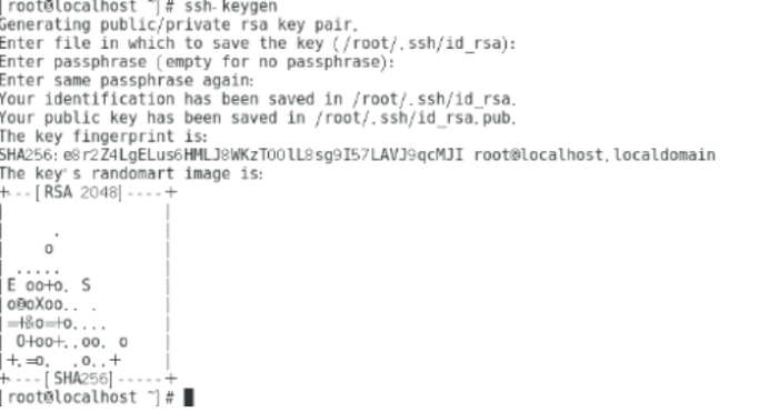 6、配置SSH密钥验证模式:在客户端A主机中生成“密钥对”。打开客户端A的终端,输入命令ssh-keygen,依次回车,结果如下图所示: