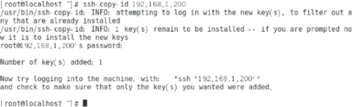 7、把客户端A主机中生成的公钥文件传送至服务端主机:在当前客户端A主机命令行中执行:ssh-copy-id 192.168.1.200(192.168.1.200为服务端IP,密码为123456),如下图所示: