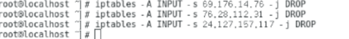 10、服务器受到了3个恶意IP攻击,分别为:69.176.14.76,76.28.112.31,24.127.157.117(恶意IP来自于赛门铁克的资料),需要配置策略禁止这3个IP数据传输。打开服务端,在终端命令行中输入如下命令,依次禁止这3个IP: