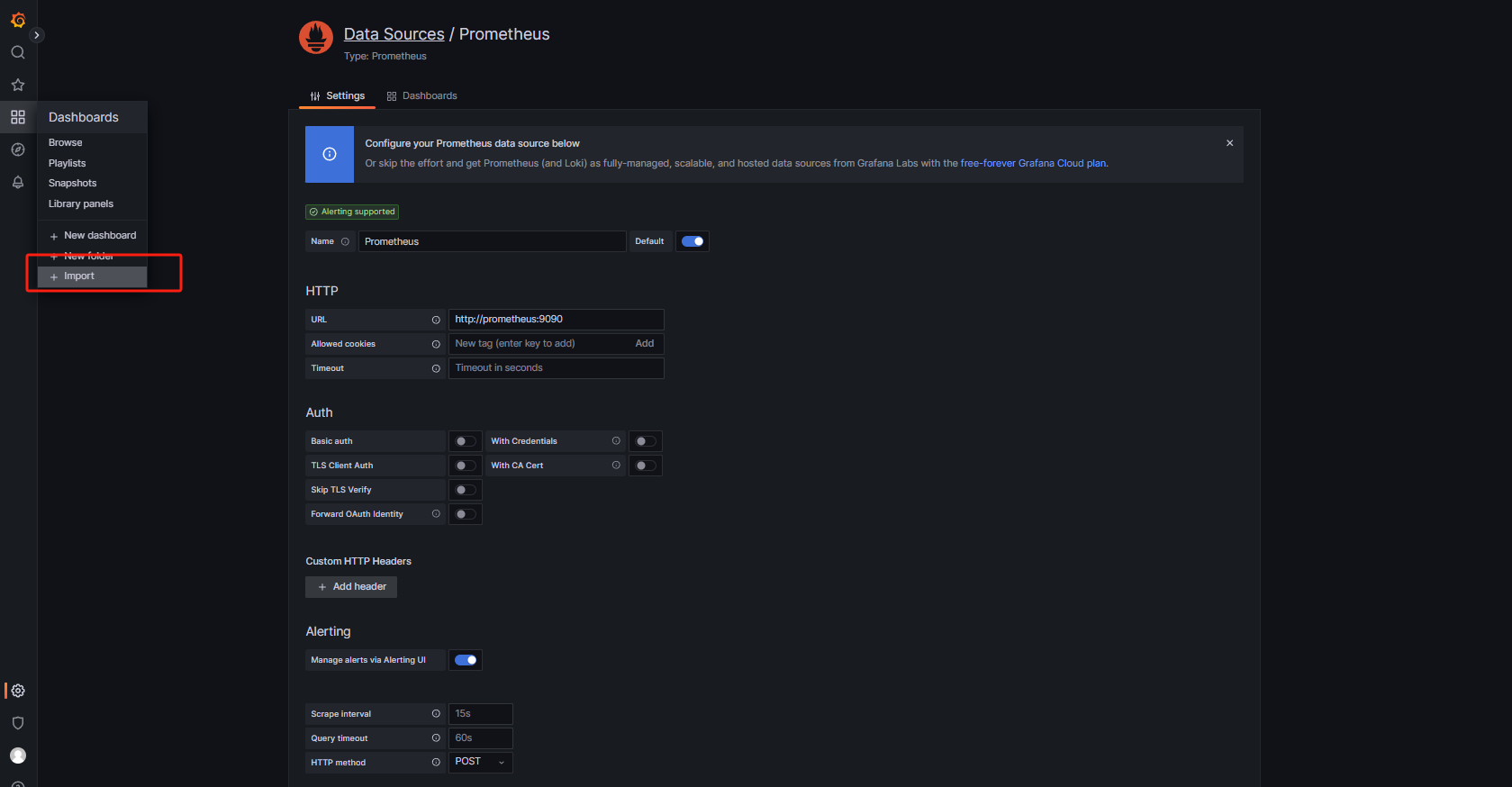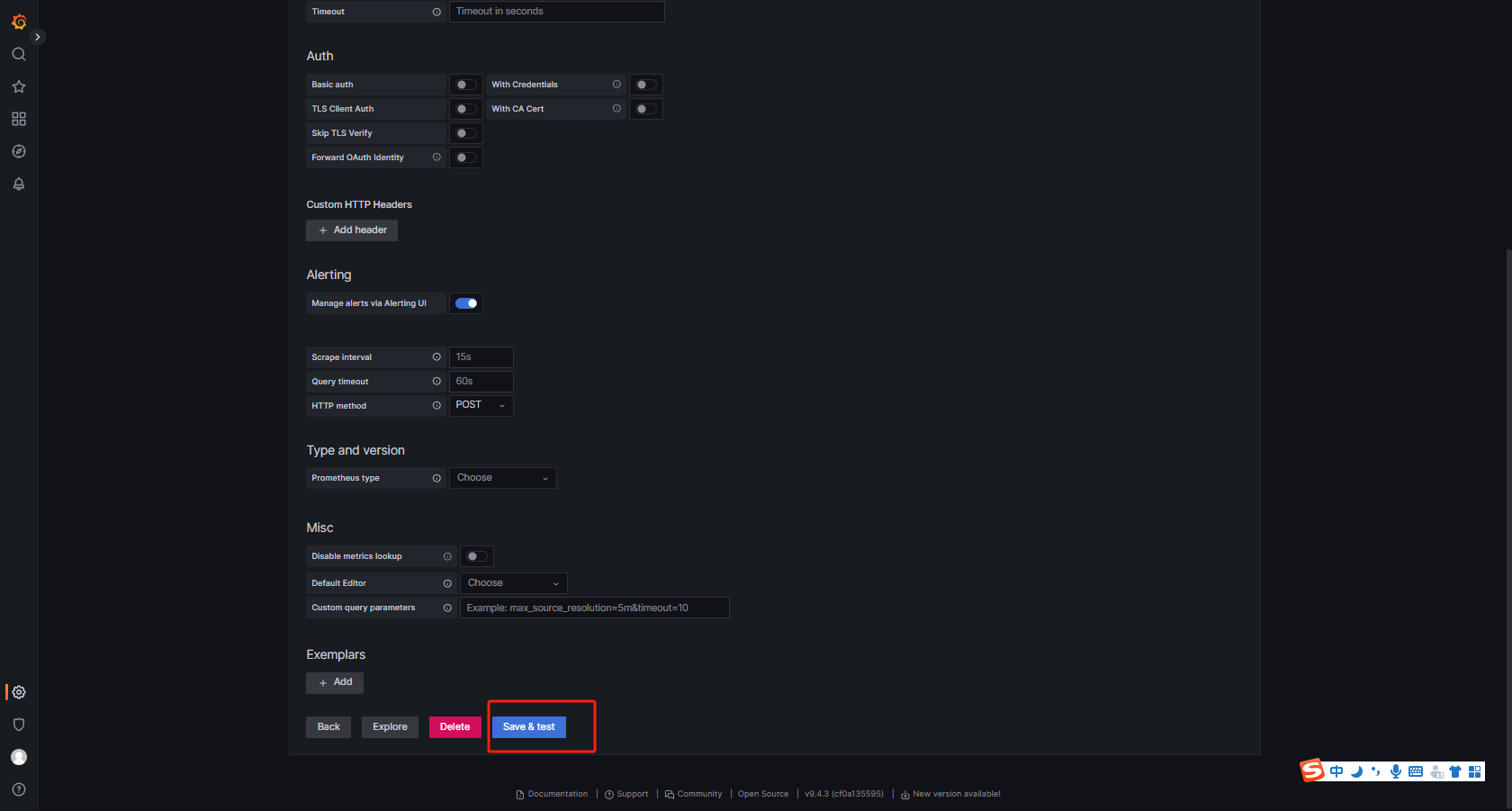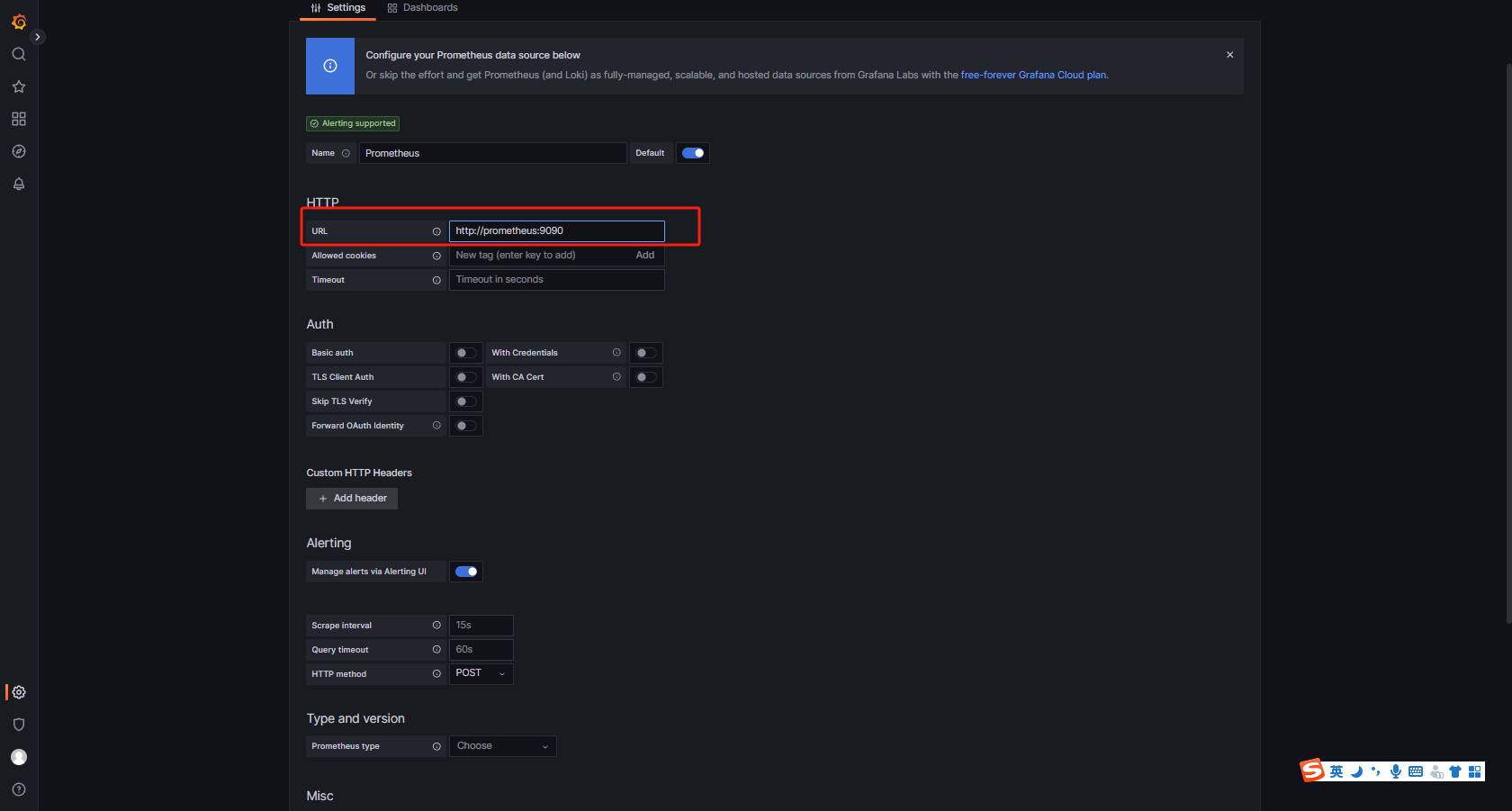 填写Prometheus的地址,这里的ip需要将服务名作为地址填写在URL中