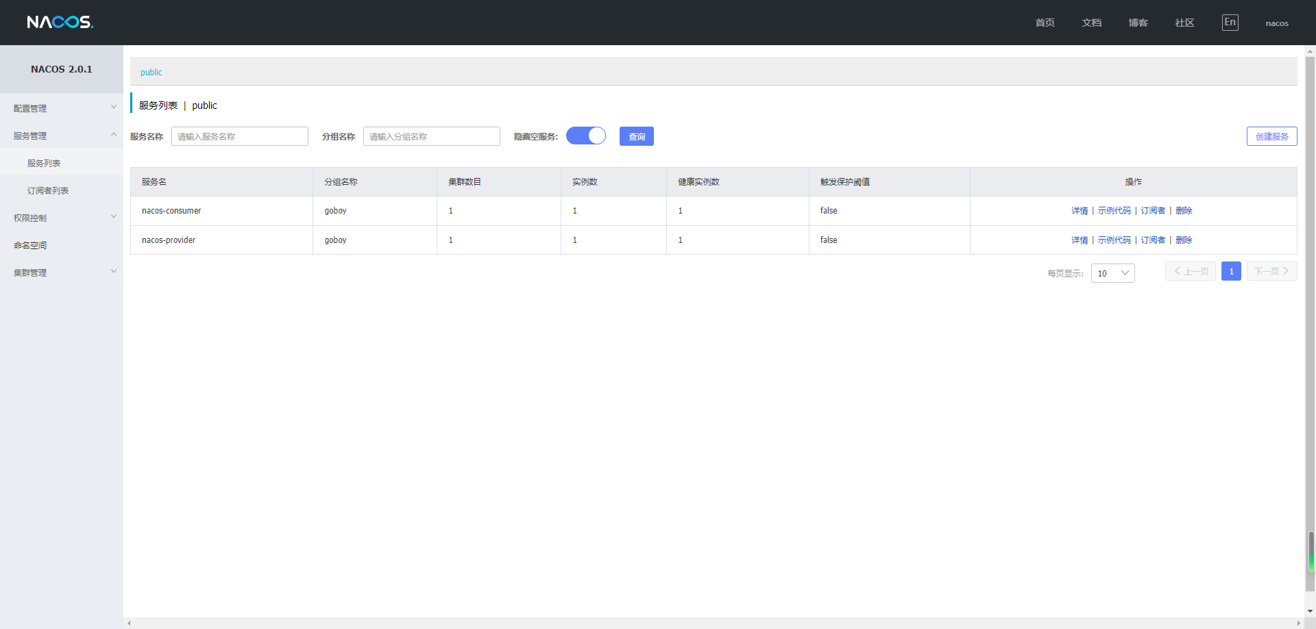 启动 nacos-consumer 和 nacos-provider 后,可以在 Nacos 控制台的服务列表中显示出两个服务