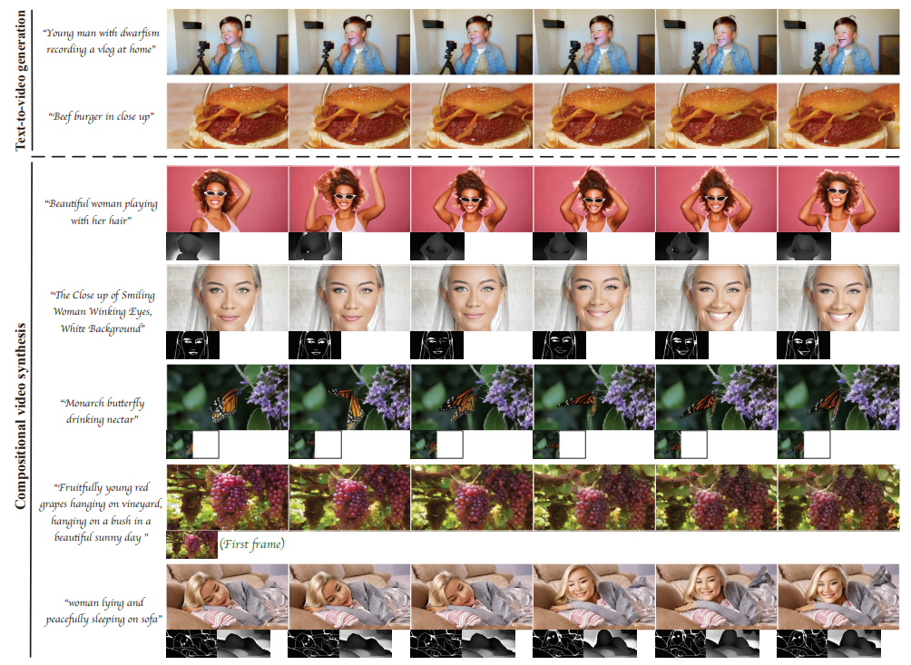 实验结果1:利用无标注视频进行文生视频和组合式视频生成任务,生成的视频可以参考项目主页。